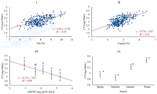 Least squares means and 95% CI of curd yield (CY) across significant variables (I: FAT (%); II: CAS (%); III: GPCNC, gram-positive catalase-negative cocci (log10[CFU/mL]); IV: season). When the trend line is presented, it means that the linear contrast (₋ ₋ ₋) was significant at p < 0.05. Means with different superscript letters are different at p < 0.05 (SNK test).