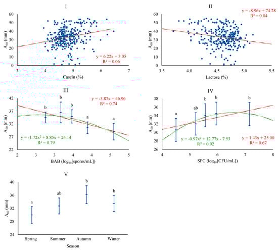 Least squares means and 95% CI of maximum curd firmness (A60) across significant variables (I: CAS (%); II: LAC (%); III: BAB, butyric acid bacteria (log10[spores/mL]); IV: SPC, total mesophilic bacteria (standard plate count) (log10[CFU/mL]); V: season). When the trend line is presented, it means that the linear (₋ ₋ ₋) and/or quadratic (₋ ₋ ₋) contrast was significant at p < 0.05. Means with different superscript letters are different at p < 0.05 (SNK test).