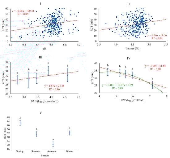 Least squares means and 95% CI of rennet clotting time (RCT) across significant variables (I: pH; II: LAC (%); III: BAB, butyric acid bacteria (log10[spores/mL]); IV: SPC, total mesophilic bacteria (standard plate count) (log10[CFU/mL]); V: Season). When the trend line is presented, it means that the linear (₋ ₋ ₋) and/or quadratic (₋ ₋ ₋) contrast was significant at p < 0.05. Means with different superscript letters are different at p < 0.05 (SNK test).