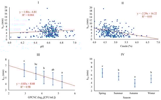 Least squares means and 95% CI of curd-firming time (k20) across significant variables (I: pH; II: CAS (%); III: GPCNC, gram-positive catalase-negative cocci (log10[CFU/mL]); IV: season). When the trend line is presented, it means that the linear contrast (₋ ₋ ₋) was significant at p < 0.05. Means with different superscript letters are different at p < 0.05 (SNK test).