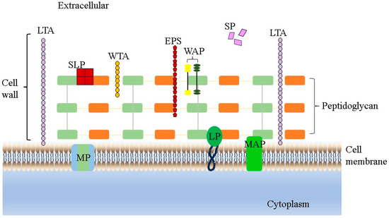 LAB cell wall structure. LTA represents lipoteichoic acids, WTA represents wall teichoic acids, EPS represents exopolysaccharides, WAP represents wall-associated proteins, SLP represents surface layer proteins, SP represents secreted proteins, MP represents membrane proteins, LP represents lipoproteins and MAP represents membrane-associated proteins.