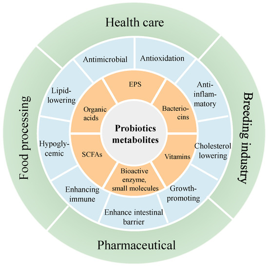 Although the traditional view is that only live probiotics can exert their probiotic effects, more and more studies have shown that some of the probiotic properties of probiotics are closely related to the active products produced by their metabolism. At present, the active metabolites of probiotics mainly include EPS, bacteriocins, organic acids, SCFAs, vitamins and some bioactive enzymes and small molecules (Figure 2). These active metabolites have been proven to have anti-inflammatory, antimicrobial, antioxidation, immune regulating properties useful for the prevention or treatment of a variety of metabolic diseases. Antimicrobial properties are one of the most notable characteristics of probiotics. This can be achieved through competition for nutrients and adhesion space, inducing environments that are harmful to pathogens, and that produce antimicrobial metabolites and regulate immune responses [46]. This subsection is devoted to the antimicrobial activity of L. salivarius strains.