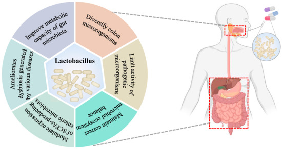 Given these facts, intestinal microflora plays a key role in the maintenance of host health and the pathogenesis of many diseases [77]. Therefore, gut microbiota eubiosis is essential for the prevention of infectious and non-infectious diseases and for preventing disturbances (also known as dysbiosis) in the balance of the microbial community equilibrium [78]. However, the gut microbiota is an open micro-ecosystem whose composition and/or activity can be influenced by many elements, including the mode of birth, sex, host inheritance, immune system and host health or disease status, geographic location, social economic factors, diet, the use of therapeutic drugs, etc. [79]. In point of fact, the intestinal microbiota is constantly exposed to transient exogenous microorganisms transmitted through food, as demonstrated by Veiga et al. [80]. In this regard, probiotics can regulate the composition of gut microbiota and correct the abnormal response of the immune system [81], thereby exerting different favorable effects on host health (Figure 3). In summary, probiotics may be a therapeutic strategy to regulate intestinal flora and improve human disease [60,82]. In this sense, several studies have found that different strains of L. salivarius have a significant regulatory effect on intestinal flora (Table 2).