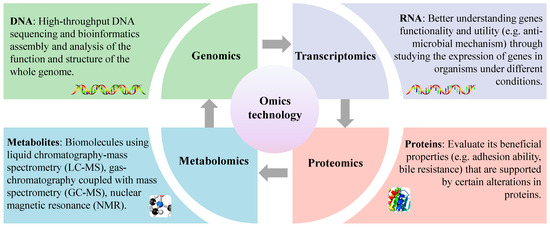Omics technology belongs to the concept of systems biology, mainly including genomics, transcriptomics, proteomics and metabolomics, etc. With the continuous improvement and evolution of omics technology research, combined with chemometric tools, people have a comprehensive and in-depth understanding of the mechanism behind the functional and specific interactions between probiotics and hosts (Figure 4). Researchers have successfully revealed the genetic information of different microorganisms with various phenotypes using these methods. Therefore, these are very useful tools to bridge the gap between genetic information and cell-specific metabolites. Among these, genomics allows for the identification of functional genes contained in the target strain and transcriptomics, proteomics and metabolomics allow for the quantification of mRNA, proteins and metabolites (<1500 Daltons), respectively, under specific physiological conditions. Therefore, it is worth noting that all of these methods are completely different from traditional characterization methods. Considering the complexity and uniqueness of organisms, a single method is not enough to characterize organisms. Most lactobacillus has been widely used in food and pharmaceutical fields. It is only recently, however, that advances in technology and methods have revealed the mechanisms that explain the beneficial effects of these bacteria on the host [100]. To date, many scholars have integrated various “omics” approaches to understanding the functional role of LAB, including L. salivarius [51].