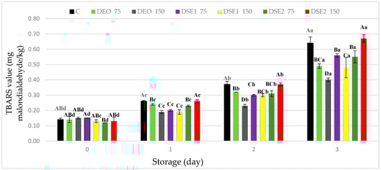 The TBARS test, despite its simplicity, represents one of the most relevant methods for examining the degree of lipid oxidation in meat and meat products (Figure 1). At the beginning of the experimental period (day 0), the measured TBARS values did not significantly differ (p > 0.05) and ranged from 0.12 mg MDA/kg (DSE275) to 0.15 mg MDA/kg (DEO150 and DSE175) (Figure 1). As expected, over the storage period, TBARS values significantly (p < 0.05) increased in all samples, including the control (C). By the end of the experimental period (the third day), the TBARS values significantly (p < 0.05) differed among the treatments, and their order from highest to lowest likelihood was DSE2150 ≥ C > DSE175 ≥ DSE275 ≥ DEO75 ≥ DSE1150 > DEO150. Based on the analysis of the obtained results, it was determined that the TBARS values of the DEO75, DEO150, and DSE1150, treatments were lower than the established threshold (≤0.5 mg MDA/kg) which is detectable by consumers [2,49].