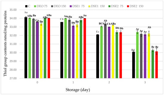 At the commencement of the experimental period (day 0), the thiol group content significantly (p < 0.05) differed among treatments (Figure 2).