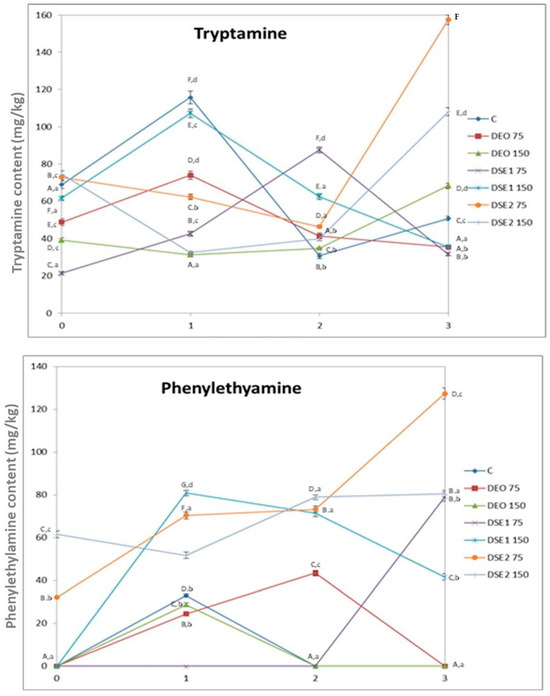 Tryptamine was determined in all analyzed samples of beef burgers with concentrations ranging from 21.4 mg/kg (DSE175, day 0) to 157 mg/kg (DSE275, day 3), while phenylethylamine was determined in 16 out of 28 samples displaying concentrations ranging from 24.4 mg/kg (DEO75, first day) to 127 mg/kg (DSE275, third day) (Figure 3). The concentrations of these two biogenic amines vary differently within different treatments during the storage period, with similar trends in DEO75 and DSE1150. Initially, there was an increase on the first day, followed by a subsequent decrease until the end of the storage period.