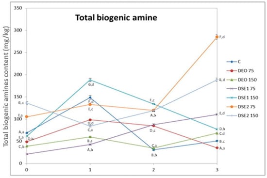 The total content of biogenic amines ranged from 21.4 mg/kg to 285 mg/kg, with the maximum level reached on the third day of storage in DSE275 treatment and minimum level reached on day 0 of storage in DSE175 treatment. Similar to tryptamine and phenylethylamine, the total content of biogenic amines exhibited varying trends of decreasing and increasing during the storage period between treatments, with clearly evident potential to reduce the total content of biogenic amines after first day of storage and treatment with DEO75 and DSE1150.