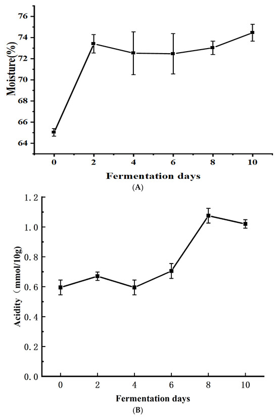 Variation of moisture and acidity with fermentation days during the Toqu fermentation of Hunan light-flavor Baijiu ((A): moisture; (B): acidity).