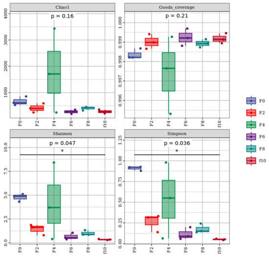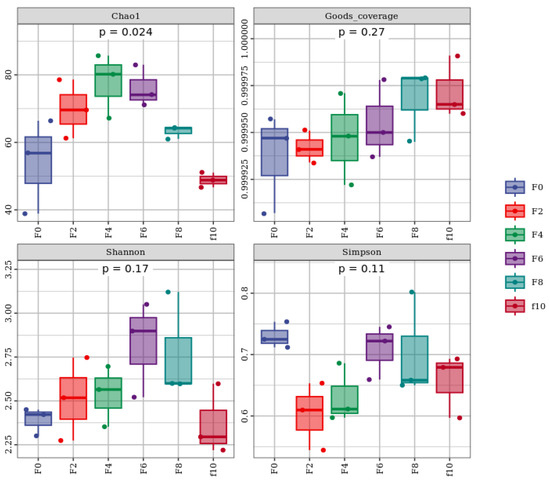 From the α-diversity index in Figure 7, it can be seen that the coverage of each group of samples was greater than 0.999, and the p value of the Chao1 index was 0.014, which indicates that the sequencing depth was sufficient. The sequences in the samples were basically detected completely, and the results were true and reliable for subsequent analysis. The Chao1 index in F4 was the highest, which indicates that the total number of fungal species was the highest in the sample groups. The Shannon index of the F6 group was the highest, which indicates that the diversity of fungal species in the F6 group was the highest in the samples.