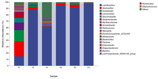 Figure 5 shows the relative abundance of species in the top 20. As seen from the figure, the bacterial flora in the fermented grains at the genus level consisted mainly of Lactobacillus, Geobacillus, Pediococcus, and Acetobacter. As the fermentation progressed, Lactobacillus accounted for over 60% of the total sequence readings at 2–10 days, and a peak value of 97.97% was observed at the tenth day. The acidity and alcoholic strength increased, which caused the extinction of many bacteria; therefore, Lactobacillus became the dominant bacteria. Lactobacillus could affect the growth of other microorganisms by producing antagonistic substances such as bacteriocins and by competing with other microorganisms for substrates [18,19]. These were the dominant bacterial genera in the fermented grains. In addition, Lactobacillus were identified as the most abundant bacteria during the fermentation of the fermented grains, which was consistent with the results revealed in previous studies [20]. The abundances of Geobacillus and Acetobacter were highest, reaching peaks of 23.75% and 17.58% at 0 days, respectively, and then decreasing gradually. During the fermentation of the liquor, Bacillus can produce some flavor synthesis precursors in addition to the direct flavor substances obtained from their own fermentation. Complex flavor substances are further synthesized by a number of chemical or biological interactions [21]. Acetobacter are specialized aerobic bacteria that play an important role in the aroma presentation of Baijiu. There are abundant bacteria, such as Acetobacter, in the environment that can break down different types of sugars and alcohols into organic acids in oxygen [22].
