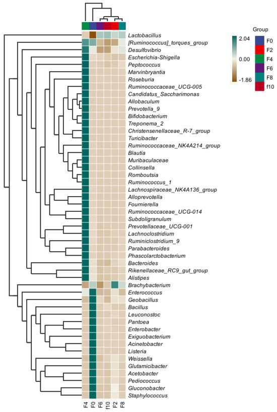 Figure 6 shows a heat map of the bacterial composition during the Tuqu fermentation of Hunan light-flavor Baijiu, where a color closer to green indicates a greater relative abundance of the species, and a color closer to brown indicates a smaller relative abundance of the genus [23]. As shown in Figure 6, the bacterial diversity and abundance in the F0 and F4 stages were more diverse, including bacteria such as Bacillus and Weissella. As fermentation progressed, the diversity and abundance in the fermented grains decreased rapidly. It is possible that the increase in acidity as well as the ethanol content inhibited the growth of these bacteria. Lactobacillus became the dominant bacterium in the fermented grains. Lactobacillus is a class of anaerobic or partly anaerobic bacteria that can ferment sugars to produce lactic acid and provide amino acids and various vitamins and bacteriocins for the growth and reproduction of other microorganisms. Lactobacillus plays an important role in the microecological environment of brewing [24].