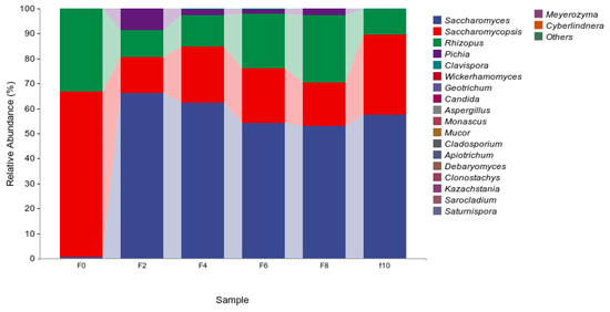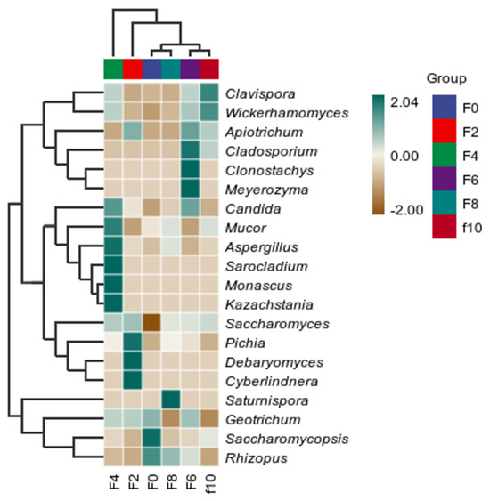 Figure 9 shows a heatmap of the fungal composition during the fermentation of Tuqu-fermented grains of Hunan light-flavor Baijiu. A color closer to green represents a higher abundance, and a color closer to brown represents a lower abundance. As shown in the graph, as fermentation progressed, there were different dominant fungi at different fermentation stages, indicating a rich microbial structure. The main dominant fungi at the F0 stage were Trichosporon, Saccharomycopsis and Rhizopus. The main dominant fungi at the F2 stage were Pichia, Debaryomyces, and Cyberlindnera. The main fungal genera at the F4 stage were Mucor, Aspergillus, Kazachstania, Monascus, and Sarociadium. The main dominant fungi at the F6 stage were Meyerozyma, Cladosporium, and Clonostachys. The main dominant fungi at the F8 stage were Rhizopus and Satumispora, and the main dominant fungi at the F10 stage were Clavispora and Wickerhamomyces. These fungi are important fungal genera in the fermentation process of Baijiu. Among them, Wickerhamomyces and Aspergillus play a key role in fermentation. Aspergillus can produce a variety of enzymes and plays a positive role in regulating the saccharification, esterification, and liquefaction power of Daqu and fermented grains. In addition, it can metabolize organic acids and fatty acids, which can lead to the production of aromatic esters that enhance and improve the flavor of Baijiu [28]. Wickerhamomyces is an important aromatic yeast with a high acidity tolerance and a high ester production capacity, which can impart a rich aroma to the liquor [29].