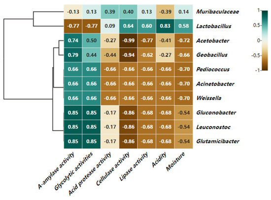 Spearman correlation analysis of physicochemical indicators and bacteria that were the top 10 bacterial genera in the fermented grains was performed using SPSS software. As shown in Figure 10 The closer the color was to green, the stronger the correlation was, and the closer it was to brown, the weaker the correlation was. As shown in the graph, Lactobacillus was positively correlated with moisture content, acidity, cellulase activity, and lipase activity, which suggests that the acidity and moisture were the main factors affecting microbial succession, which is consistent with previous research on the light-flavor liquor [30] indicating that Lactobacillus might produce cellulase and lipase [31]. Lactobacillus has a strong ability to metabolize carbohydrates and produce acid, providing a source of carbon for other microorganisms. It is a precursor to the formation of flavor during the fermentation of liquor [32]. The other three genera, Geobacillus, Pediococcus, and Acetobaceter, which were ranked in the top four relative abundances, were all negatively correlated with the moisture content, acidity, cellulase activity, and lipase activity. This was due to the presence of diacetyl in the metabolites of Lactobacillus, which inhibits many spoilage and pathogenic bacteria. Moreover, it could inhibit the growth of gram-negative bacteria by interfering with the utilization of arginine through the binding protein reaction of gram-negative bacteria with arginine [33].