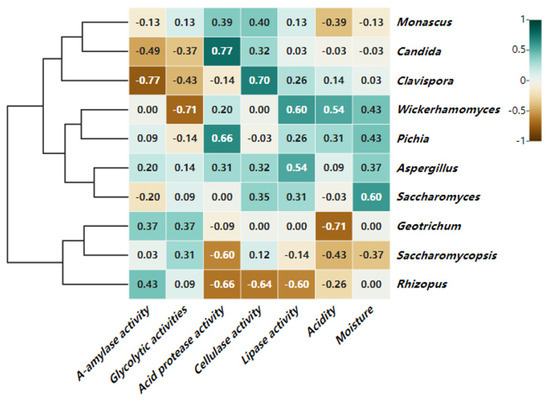 As shown in Figure 11, there were significant interactions between physicochemical factors and most fungal microorganisms, indicating the complexity of the fungal microbial metabolism. Moisture content and acidity were positively correlated with Pichia and Wickerhamomyces; moisture content, acidity, lipase activity, acid protease activity, and A-amylase activity were negatively correlated with Saccharomycopsis and Rhizopus; cellulase activity was positively correlated with Clavwaspora and Wickerhamomyces; and glucoamylase activity was positively correlated with Rhizopus. Traditionally, Rhizoctonia solani and others were considered to be the main producers of the saccharification power of macrophytes, which is consistent with the results in this study. The strong positive correlation between acid protease activity and the first dominant bacterium Saccharomyces suggests that acid protease production might be associated with yeasts, and Saccharomycopsis has been shown to produce acidic proteases capable of degrading large proteins [34].