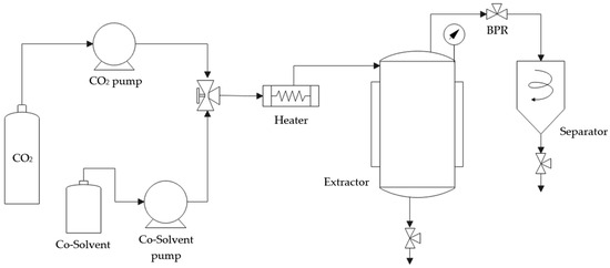 The extraction of antioxidant compounds from olive pruning waste was performed by enhanced solvent extraction. The best conditions of pressure (120 bar), temperature (80 °C) and CO2 flow rate (10 g/min) from previous studies were used [28]. The extraction was performed for 24 h in an SF100 pilot plant developed by Thar Technologies (Pittsburgh, PA, USA). This plant, which is shown in Figure 1, included an extraction vessel of 1 L, two high-pressure pumps for co-solvent (ethanol) and CO2, a back-pressure regulator to control system pressure and a separator at the end of the line.