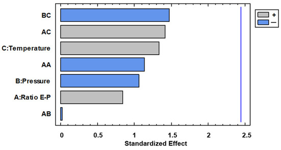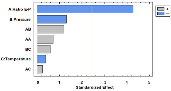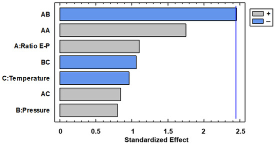 With regard to total polyphenol content, it can be observed in the Pareto diagram of Figure 8 that Extract–Polymer ratio was the only variable with significance.
