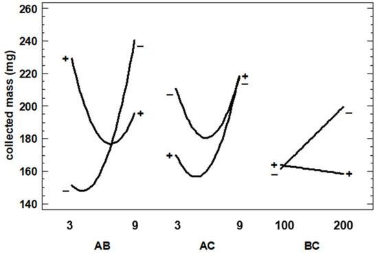 In this Figure, it can be seen how the behavior of one variable is dependent on whether another one changes from its low to its high value. In this sense, it could be found that the variable is independent of another variable or even have an inversion of the trend. In the case of Extract–Polymer ratio × Pressure (AB), according to Figure 4, at a low ratio (1:3), the collected mass increases when pressure is increased, but at a high ratio (1:9), the collected mass increases when pressure is decreased.
