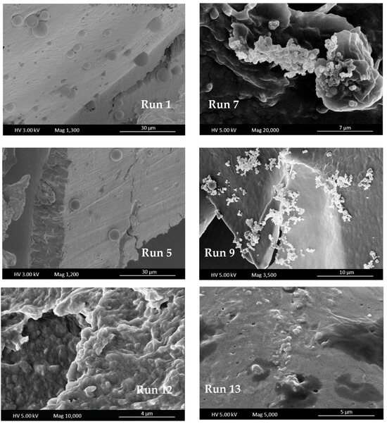 On the other hand, the morphology of the particles was different depending on the operating conditions. In Figure 5, examples of different situations are shown: extracted spherical particles encapsulated by the polymer that was immersed, in turn, in a polymer matrix (run 1), or precipitated extracts on the polymer surface (runs 7 and 14) or even extracts precipitated totally covered by a layer of polymer (run 13). In this sense, only the particles corresponding to runs 1, 5, 7, 8, 9 and 14 with mean particle size from 0.3 ± 0.9 to 4.6 ± 3.9 µm could be measured.