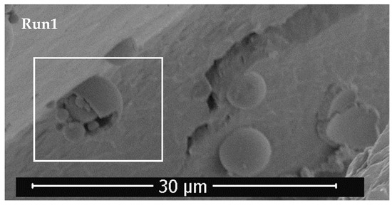 In Figure 6 can be seen a broken polymer sphere containing smaller spheres of pruning waste extract. As can be observed in SEM images, these spheres that are encapsulated are also immersed in a layer of polymer. Thus, the difference in size of precipitated particles lies in whether the process achieves encapsulation or if precipitated particles of extract remain on the polymer surface. Olive leaf particles were precipitated in previous work [29] in the submicron range, similar to runs 7–9, and when the polymer encapsulation happens, the precipitated particles increased their size to 5–7 µm. The influence of operating conditions on particle size cannot be described, mostly due to experiments not resulting in precipitation in the form of particles.