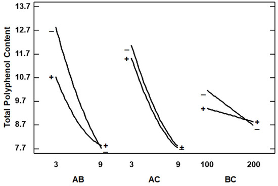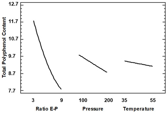 In Figure 9 is shown the main effect on TPC, and it can be observed that effectively the curve of the Extract–Polymer ratio has a high slope, indicating the strong influence on TPC. Thus, a lower Extract–Polymer ratio is recommended to increase the amount of polyphenol in the composites. This trend is expected due to the composites being formed by a smaller amount of polymer. Thus, these data do not agree with AAI since it would be expected that the higher the AAI, the higher the TPC, and this showed the opposite trend: the higher the TPC, the lower the AAI. We analyzed the interaction plots shown in Figure 10, and lower ratios and lower pressures are recommended to increase the amount of polyphenols in the sample, but at this ratio, temperature does not have any influence. This discrepancy between the data on antioxidant activity and total phenolic content in the encapsulates can be explained by several reasons. Firstly, the composition of both the initial extract and the capsules is extremely complex in terms of existing compounds. The fact that the SAE technique generally concentrates the particles on certain compounds does not mean that, due to the multitude of other compounds, the final antioxidant activity changes as the total phenolic content changes [34]. On the other hand, according to another possible explanation, other authors confirm that under certain conditions, antioxidants can act as pro-oxidant species related to their redox potential and the concentration of these antioxidants in the matrix environments [35]. In general, due to the high complexity of the extract in terms of compounds present, further optimization studies on the selectivity of the process are necessary.
