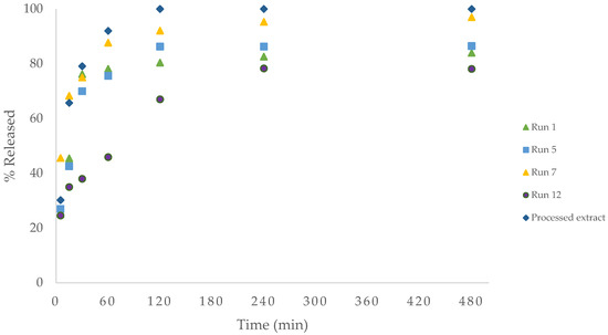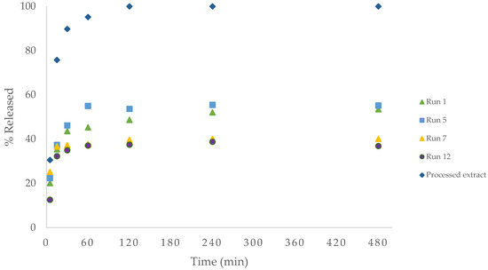 In general, the release of the unencapsulated extract particles is faster than that of the drug–polymer systems in both fluids. As can be observed in Figure 11, there is a lower release of the extract in the encapsulated samples, possibly due to the fact that Pluronic F-127 has low solubility in acidic medium [41,42]. Additionally, the samples experienced a rapid burst release during the initial stage, likely due to the rapid release of surface-bound drug molecules. Other authors argue that the rapid initial release in drug–polymer systems is due to diffusion of the drug through the matrix [43]. Thus, the rest of the compounds remain immobilized within the crystalline domains and are released only when the matrix degrades to a higher pH in this specific case. It is worth noting that the lowest release of the compounds was in run 12, where it is possible that the extract precipitated totally, covered by a layer of Pluronic, as its particle size could not be measured due to its low homogeneity.