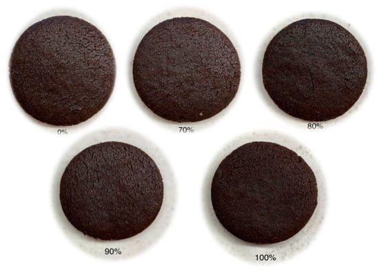Evaluating various affective sensory modalities not only enhances our understanding of sensory techniques but also opens new possibilities for incorporating novel ingredients []. A crucial aspect of this evaluation involves determining the factors that influence the acceptance or rejection of a particular food item []. To date, no research has been conducted on the development of cocoa cookies prepared using a combination of teosinte and mung bean flours. Consequently, the primary objective of this study was to evaluate physicochemical properties and consumer perceptions of gluten-free cocoa cookies formulated with mung bean (Vigna radiata) flour that was substituted with teosinte (Dioon mejiae) flours at varying levels from 70% to 100% by weight. By incorporating teosinte flour into the cookie formulation, we aimed to assess its impact on the texture, taste, and overall acceptability of the final product. Additionally, sensory evaluations were conducted to gather valuable insights into consumer preferences that led to a consumer “rejection threshold” of teosinte flour addition. Understanding how teosinte flour interacts with mung bean flour in the context of cocoa cookies will contribute to expanding the repertoire of gluten-free alternatives and promoting the use of underutilized ingredients, i.e., teosinte flour.