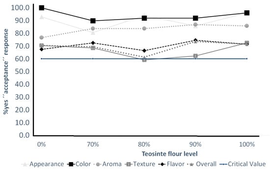 The samples’ appearance, color, aroma, texture, flavor, and overall quality did not experience a substantial drop in acceptability with increasing teosinte flour levels (Figure 2). The “yes” acceptability responses for these sensory attributes were above the critical value (60% when n = 100 at α = 0.05). In other words, no rejection tolerance threshold (RTT) was found for all samples based on appearance, color, aroma, texture, flavor, and overall quality.