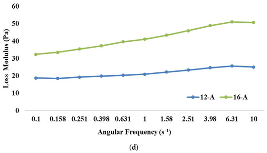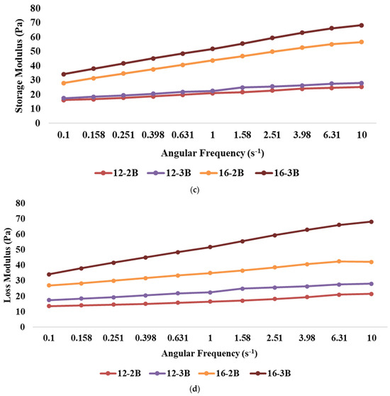 The presence of frequency dependence is indicated by a significant change in the dynamic moduli (G′ or G″) of the material with variations in frequency. The results revealed that the highest storage modulus (p < 0.05) was exhibited by 16-3B, followed by 16-2B, 12-3B and 12-2B (Figure 2c), indicating that an increase in the TS level resulted in a higher storage modulus, which might be attributed to the presence of more solid particles in the system. Higher TS levels also lead to increased intermolecular interactions and the formation of a stronger network structure, thus resulting in a higher storage modulus [48]. Furthermore, stronger metabolic activity in 16-3B due to a larger number of lactic acid bacteria might have contributed to a greater casein micelle-binding property, thereby resulting in a reduced pH, lesser whey syneresis and higher viscosity [63]. Similar to the storage modulus, the highest loss modulus (p < 0.05) was shown by 16-3B, followed by 16-2B, 12-3B and 12-2B (Figure 2d). However, the values of the loss modulus were always lower as compared to the storage modulus for all the yoghurt samples.