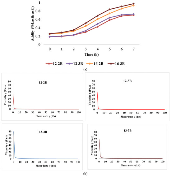 Figure 2a depicts the rate of acid development of the yoghurt samples over time. Initially, the acidity (% lactic acid) was 0.187, 0.191, 0.251, and 0.262 for the 12-2B, 12-3B, 16-2B, and 16-3B samples, respectively, which was an increase of 17.98%, 17.31%, 22.04% and 24.72%, respectively, after 2 h of fermentation. Also, after the initial 2 h, acidity increased significantly (p < 0.05) at both TS levels. Further, at the end of 7 h of fermentation, the acidity levels (% lactic acid) reached 0.706, 0.728, 0.937, and 0.978 for the 12-2B, 12-3B, 16-2B, and 16-3B samples, respectively. Further, 12-3B had significantly higher (p < 0.05) acidity as compared to 12-2B and a similar trend was observed with 16-2B and 16-3B throughout the fermentation period of 7 h. This indicates that a higher culture level induces more acid production, thereby increasing the acidity level. A similar increase in acidity levels with the increase in the culture level has been demonstrated by Yadav et al. [60] in buffalo milk set-type yoghurt.