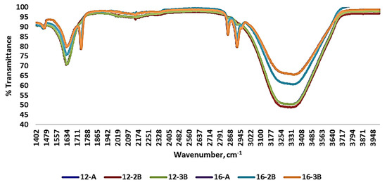 Fourier-transform infrared spectra of Barbari goat milk yoghurt prepared with different total solids levels of milk, types of culture and culture levels. (12-A: milk with 12% total solids level and commercial culture; 16-A: milk with 16% total solids level and commercial culture; 12-2B: milk with 12% total solids level and @2% NCDC-263 culture; 16-2B: milk with 16% total solids level and @2% NCDC-263 culture; 12-3B: milk with 12% total solids level and @3% NCDC-263 culture; 16-3B: milk with 16% total solids level and @3% NCDC-263 culture).