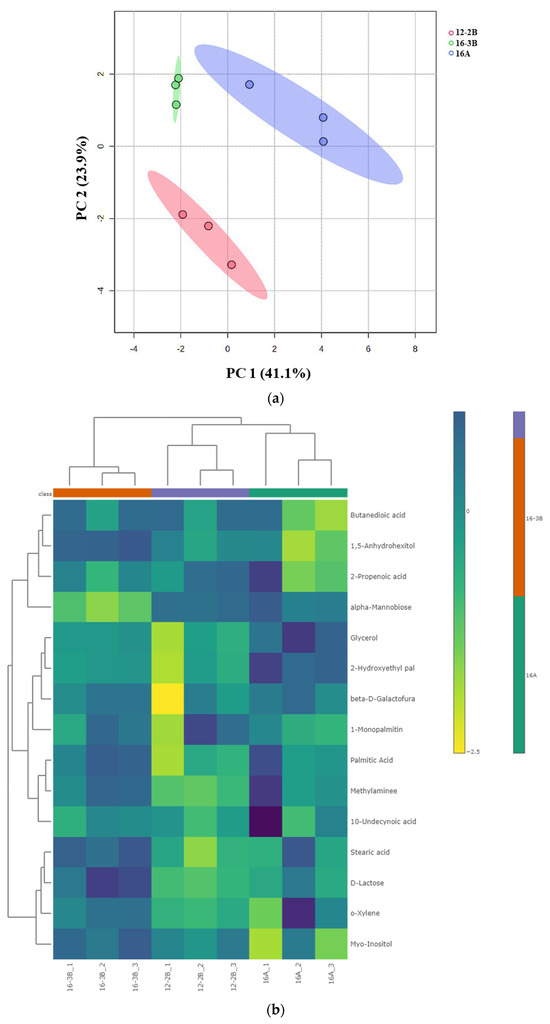 (a) Principal component analysis (PCA) depicting the score plot for Barbari goat milk yoghurt. Component 1 accounted for 41.1% of the variation in the yoghurt, which arose due to the influence of the total solids level, type of culture and culture levels; Component 2 accounted for 23.9% of the variation in the goat milk yoghurt, which arose due to the influence of the total solid level, type of culture and culture levels (16-A: milk with 16% total solids level and commercial culture; 12-2B: milk with 12% total solids level and @2% NCDC-263 culture; 16-3B: milk with 16% total solids level and @3% NCDC-263 culture). (b) Heat map of hierarchal clustering analysis of differential metabolites (p < 0.05) for Barbari goat milk yoghurt under the influence of different total solids, the type of culture and culture level. Coloured cells correspond to the concentration value (samples in column and compounds in row). Data presented were normalized and subjected to T-test/ANOVA and features were standardized to autoscaling. (16-A: milk with 16% total solids level and commercial culture; 12-2B: milk with 12% total solids level and @2% NCDC-263 culture; 16-3B: milk with 16% total solids level and @3% NCDC-263 culture).