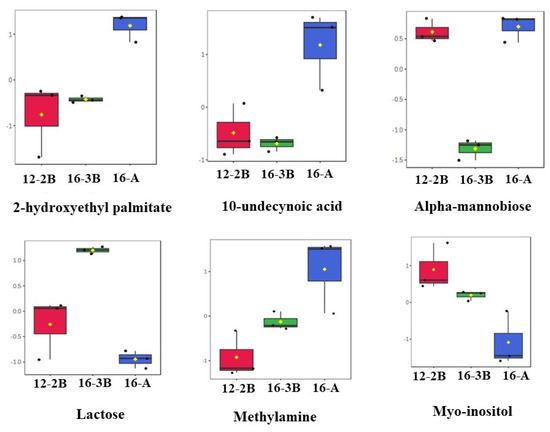 A total of 15 differentially regulated metabolites were further analysed with an ANOVA test, and it was found that out of the 15 metabolites, 6 metabolites, namely, alpha-Mannobiose, Lactose, 2-Hydroxyethyl palmitate, 10-Undecynoic acid, Myo-Inositol, and Methylamine, had a p < 0.01. The changes in the relative concentration of these six differentially regulated metabolites is presented in the form of box-and-whisker plots (Figure 5). The results revealed that sugars, mainly lactose and myo-inositol, were in relatively lower concentrations (p < 0.05) in the 16-A samples than the other two samples. Myo-inositol could be considered as one of the intermediaries during the conversion of lactose to lactic acid. These findings also suggest that a relatively lower concentration (p < 0.05) of sugars in the 16-A samples and a higher concentration (p < 0.05) of fatty acids (10-undecynoic acid and 2-hydroxyethyl palmitate) in 16-3B and 12-2B might be related to the efficient and rapid metabolism of lactose to lactic acid by the starter culture, thereby indicating the significant effect (p < 0.05) of the type of culture altering the metabolite profile of the yoghurt samples. Moreover, a higher concentration of fatty acids in 16-A indicates the stronger proteolytic action of the commercial culture as compared to NCDC 263 [70].