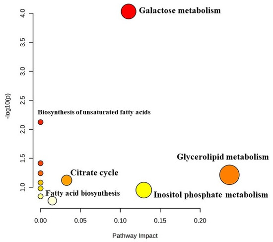 KEGG pathway analysis was employed to investigate the biological processes that are associated with differentially expressed metabolites (Figure 6). Pathway impact analysis revealed galactose metabolism (p < 0.01; 0.11 impact value), glycerolipid metabolism (p < 0.05; 0.2 impact value) and citrate metabolism (p < 0.05; 0.03 impact value). Significantly impacted galactose metabolism indicated the utilization of lactose by the starter culture to produce lactic acid, which reduced the pH of the yoghurt and brought desirable biochemical changes in the milk for the fermentation process. Metabolites, namely, lactose, myo-inositol and glycerol, were found be to be involved in galactose metabolism. Further, the metabolism of glycerolipids includes the synthesis of various glycerolipid molecules (mono-, di-, and tri-acylglycerols,), which involves glycerol as a metabolite. Hexadecanoic acid and octadecanoic acid were associated with biosynthesis of fatty acids, while succinate was involved in the citrate cycle. Therefore, the results of the analysis indicate that there are certain metabolites which regulate the pathways for the desired attributes of yoghurt.