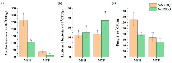 Cultivable microbial counts in S-NXDQ and N-NXDQ. (a) Cultivable aerobic bacterial counts. (b) Lactic acid bacterial counts. (c) Fungal counts. Letters above bars indicate significance markers, and different letters were significantly different (p < 0.05).