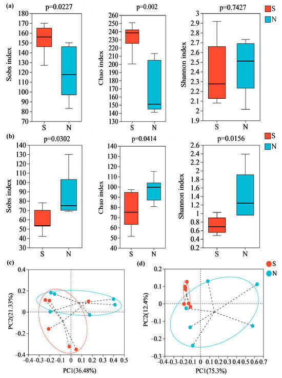 3.3. Microbial Community α-Diversity and β-Diversity between S- and N-NXDQ