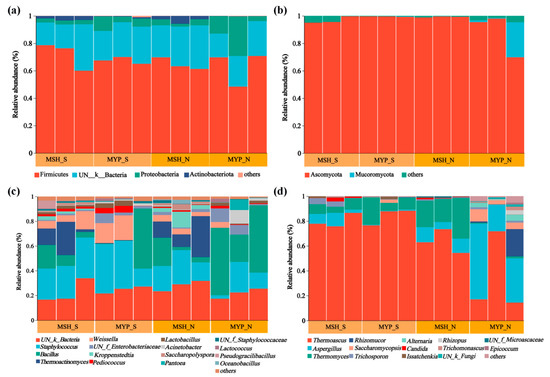 The relative abundance (more than 1%) of microbiota composition at phylum and genus level is shown in Figure 3. Four bacterial phyla, including Firmicutes, unclassified_K_Bacteria (UN_K_Bacteria), Proteobacteria and Actinobacteria (Figure 3a), and two fungal phyla, including Ascomycota and Mucoromycota (Figure 3b), were found to be the dominant phyla, which accounted for more than 98% of the total microorganisms. There was no obvious difference in the composition of bacterial and fungal phyla between S- and N-NXDQ, while the average relative abundance of the dominant three fungal phyla in MYP_N was higher than that in MYP_S, respectively. Sixteen bacterial genera and fourteen fungal genera were found. The dominant bacterial genera were UN_k_Bacteria, Staphylococcus, Bacillus, Thermoactinomyces, Weissella, UN_f_Enterobacteriaceae and Kroppenstedtia (Figure 3c). Furthermore, the average abundance of Staphylococcus (29.65%) and Weissella (10.33%) in S-NXDQ was obviously higher than that (17.28% and 2.98%) in N-NXDQ, while the average abundance of Bacillus (26.75%) and Thermoactinomyces (9.44%) in N-NXDQ was higher than that (13.58% and 7.24%) in S-NXDQ. The fungal genera was dominated by Thermoascus, Aspergillus, Thermomyces, Rhizomucor and Saccharomycopsis (Figure 3d). Meanwhile, Thermoascus was relatively higher in S-NXDQ (82.09%) than that in N-NXDQ (48.96%). On the contrary, Aspergillus presented the highest average abundance in N-NXDQ (24.52%), especially in MYP_N (39.26%), which was obviously higher than that in S-NXDQ (3.84%). Thermoascus and Aspergillus accounted for more than 74% of the fungal community in N-NXDQ. In addition, the average abundance of Rhizomucor and Saccharomycopsis in N-NXDQ was higher than that in S-NXDQ.