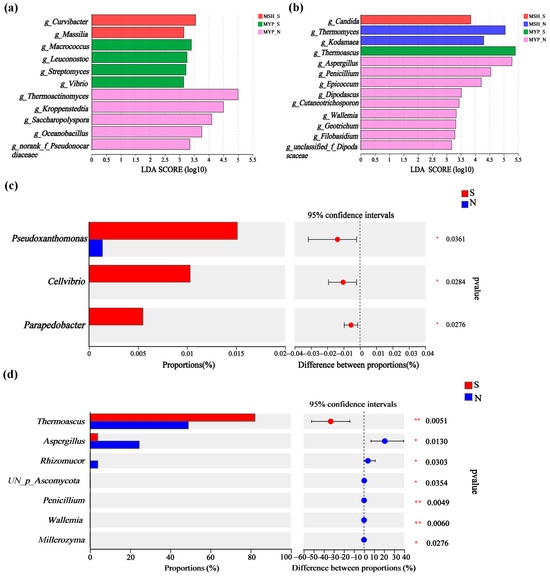 Based on the linear discriminant analysis (LDA) effect size (LEfSe) and Wilcoxon rank-sum test, the variance in microorganisms in the two grades of NXDQ are shown in Figure 4. Eleven bacterial genera and thirteen fungal genera were identified as differential taxa with significantly different relative abundance (p < 0.05). MSH_N and MYP_N had more differential bacteria and fungi, respectively. Curvibacter, Macrococcus and Thermoactinomyces were significantly enriched in MYP_S, MSH_S and MSH_N samples, respectively. Meanwhile, Candida, Thermomyces, Thermoascus and Aspergillus were enriched in MSH_S, MSH_N, MYP_S and MYP_N samples, respectively. The rank-sum test showed that Pseudoxanthomonas, Cellvibrio and Parapedobacter in S-NXDQ were significantly higher than those in N-NXDQ. In the fungal genera, except for Thermoascus, the relative abundance of the other six fungal genera in N-NXDQ was significantly higher than that in S-NXDQ. These differential bacteria and fungi could be used as biomarkers.