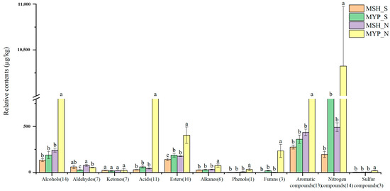 Relative content of the dominant categories of volatile compounds in two grades of NXDQ. Different letters represent significant differences (p < 0.05).