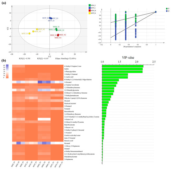 A total of ninety-seven volatile compounds, including alcohols, aldehydes, ketones, acids, esters, alkanes, phenols, furans, aromatic compounds, nitrogen-containing compounds, sulfur-containing compounds and others, was determined (Supplementary Materials Table S1). Figure 5 indicated that the content of most of the volatile compounds was not significantly different between MSH_S and MSH_N, while the content of dominant volatile compounds in MYP_N was significantly higher than that in other samples. The results of the OPLS-DA model based on volatile compounds (Figure 6a) showed that S- and N-NXDQ were significantly separated. Meanwhile, the R2Ycum and Q2cum values were 0.966 and 0.944, respectively, suggesting that the model had good accuracy and predictability. Thirty-six differential volatile compounds, including six alcohols, eleven aldehydes and ketones, four esters, six aromatic compounds, four nitrogen-containing compounds and five other compounds, were identified by the VIP analysis (Figure 6b). The total of alcohols, aldehydes and ketones was seventeen, which accounted for approximately half of the total differential compounds, and had the higher content in N-NXDQ. Except for 2,5-Dimethylpyrazine, the content of other nitrogen-containing compounds in S-NXDQ was higher than that in N-NXDQ (Figure 6b). These compounds could be used as biomarkers of volatile metabolites.