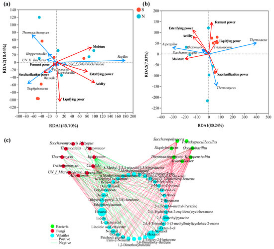 RDA of the relationship between physicochemical properties and (a) bacterial genera and (b) fungal genera, and the network visualization of the correlation (c) between microbial genera and discriminatory volatile compounds. The red arrows represent physicochemical indexes, the blue arrows represent bacterial and fungal genera, and the arrow length represents the degree of relationship. The nodes represent the number of microbial genera and volatile compounds (VIP score > 1.0) which are significantly related, the red edge and the green edge represent the positive correlation (ρ > 0.7 and p < 0.05) and the negative correlation (|ρ| > 0.7, ρ < 0, and p < 0.05), respectively.
