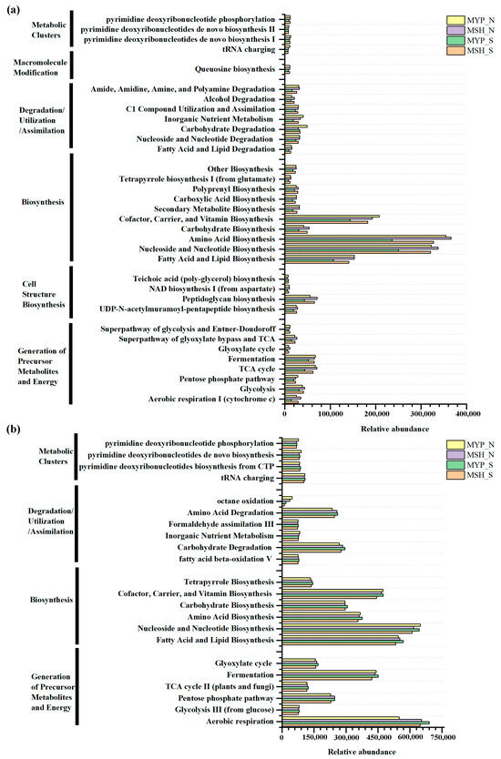 Based on commercial databases of KEGG and MetaCyc [26], the metabolic pathway enrichment was analyzed. A total of three hundred and ninety-nine bacterial metabolic pathways and seventy-four fungal metabolic pathways were obtained in the context of MetaCyc analysis. It can be observed from Figure 8a, that bacterial communities mainly presented six metabolic pathways, including metabolic clusters, macromolecule modification, degradation/utilization/assimilation, biosynthesis, cell structure biosynthesis, and generation of precursor metabolites and energy, while fungal community mainly detected four pathways, including metabolic clusters, degradation/utilization/assimilation, biosynthesis, and generation of precursor metabolites and energy (Figure 8b). Furthermore, the metabolic pathways in two grades of NXDQ mainly focused on the bacterial biosynthesis and on the fungal biosynthesis and generation of precursor metabolites and energy. Compared with the bacterial community, the fungal community had a higher abundance of dominant metabolic pathways, especially in carbohydrate degradation, amino acid degradation, fatty acid and lipid biosynthesis and fermentation. However, the differences of the bacterial metabolic pathways between S- and N-NXDQs were more obvious.