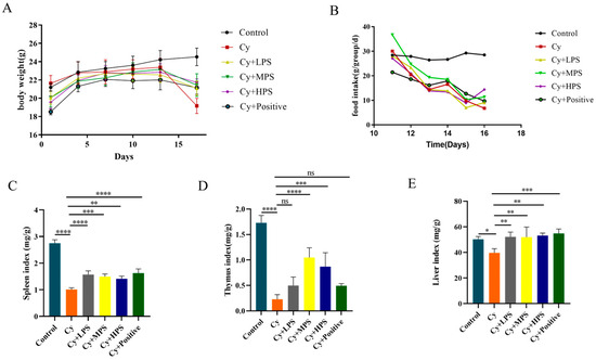 Effect of PS on the organ index. (A) Body weight. (B) Food intake (C) Spleen index (D) Thymus index (E) Liver index. Compared with the control. Data are shown as mean ± SEM (n = 12). * p < 0.05, ** p < 0.01, *** p < 0.001, **** p < 0.0001, ns means not statistically significant..