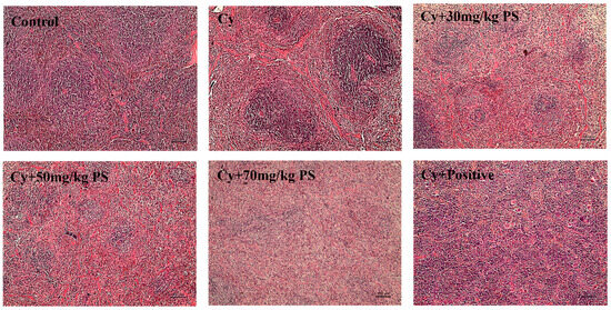The protective effect of PS on hematopoietic damage caused by cyclophosphamide was evaluated by detecting the number of WBC, RBC, HGB, HCT, PLT, LYM, and GRAN in whole blood. As shown in Table 2, compared to the control group, the number of WBC, HGB, HCT, PLT, and LYM in the Cy group was sharply decreased (p < 0.0001), and the number of RBC and Gran in the Cy group also decreased (p < 0.05). The number of WBC, HGB, HCT, PLT, and Lym in Cy + LPS, Cy + MPS, and Cy + HPS groups was significantly increased (p < 0.05) compared to the Cy group, and the number of RBC and Gran in the three treatment groups increased significantly. These demonstrated that PS reduced the decline in hematopoietic function caused by cyclophosphamide.