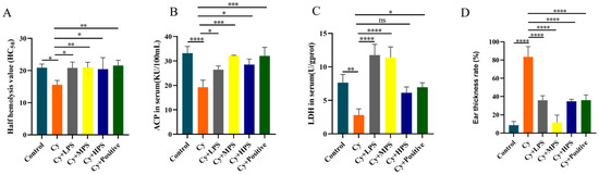 Effect of PS on hemolysin levels (HC50), acid phosphatase (ACP), lactate dehydrogenase (LDH) in mouse serum, and ear swelling rates in cyclophosphamide-induced mice. (A) Hemolysin values. (B) Acid phosphatase. (C) Lactate dehydrogenase (LDH). (D) Ear swelling rates (%). Compared with the control. Data are shown as mean ± SEM. * p < 0.05, ** p < 0.01, *** p < 0.001, **** p < 0.0001, ns means not statistically significant.