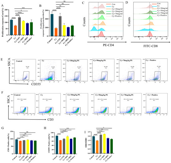To determine the effect of PS on immune cells in Cyclophosphamide-induced immunosuppressed mice, splenic lymphocyte proliferation and lymphocyte subsets were analyzed. As shown in Figure 4A,B, the proliferation of B lymphocytes caused by lipopolysaccharides and the proliferation of T lymphocytes induced by ConA were measured. In comparison to the control group, the proportion of lymphocyte proliferation decreased in the cyclophosphamide treatment group (p < 0.0001) and PS at three different concentrations all improved lymphocyte proliferation in immunosuppressed mice to varying degrees (p < 0.05 or p < 0.01). As shown in Figure 4C–I, cyclophosphamide decreased the ratio of CD3+ and CD355+ and the CD4+/CD8+ ratio decreased. After treatment with PS, the number of CD3+ T cells and CD355+ T cells increased, the ratio of CD3+ T cells in LPS, MPS, and HPS increased by 3.8%, 6.4%, and 2.9%, respectively, and the ratio of CD355+T cells in the three groups increased by 7.1%, 18%, and 6.8%, respectively. At the same time, the CD4+/CD8+ ratio in the treatment group was also improved compared to the Cy group.