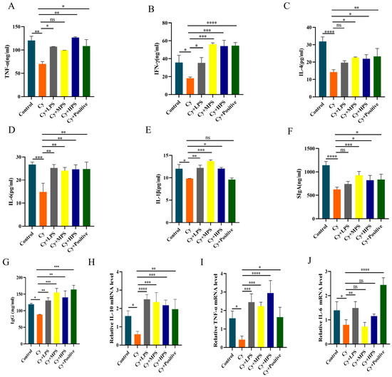 PS modulated cyclophosphamide-induced changes in serum cytokines and immunoglobulins and in spleen histology (A) TNF-α. (B) IFN-γ. (C) IL-4. (D) IL-6. (E) IL-1β. (F) SIgA. (G) IgG. (H) IL-10 mRNA level. (I) TNF-α mRNA level. (J) IL-6 mRNA level. Compared with the control. Data are shown as mean ± SEM. * p < 0.05, ** p < 0.01, *** p < 0.001, **** p < 0.0001, ns means not statistically significant.