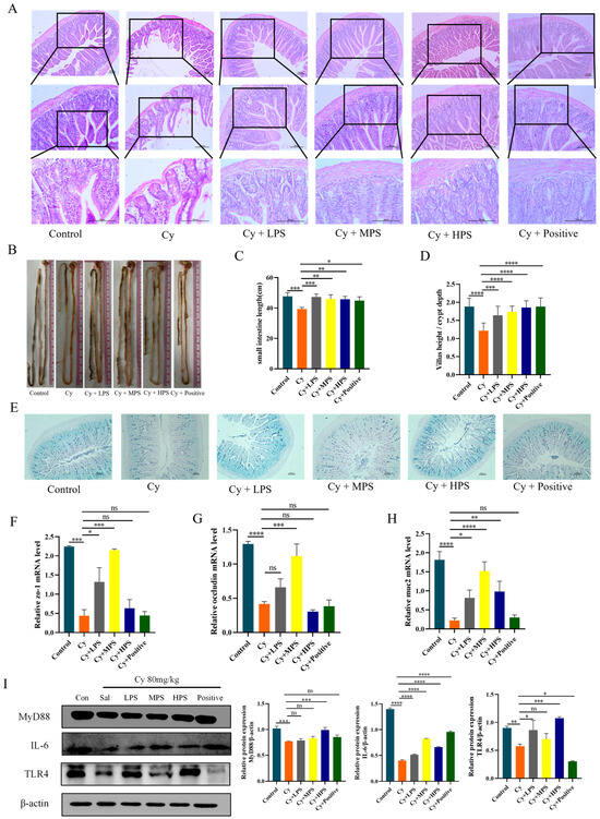 PS enhanced the intestinal barrier in Cyclophosphamide-induced immunosuppressed mice. (A) Images of hematoxylin and eosin-stained sections. (B) small intestine length. (C) The ratio of villi length to crypt depth. (D) small intestine length. (E) Images of AB/PAS-stained sections of the small intestine. Effect of MP on the relative expression of intestinal-related genes (F) ZO-1. (G) Occludin. (H) Muc2. (I) Effect of PS on MyD88/IL-6 pathway in the small intestine of immunosuppressed mice. Compared with the control. Data are shown as mean ± SEM. * p < 0.05, ** p < 0.01, *** p < 0.001, **** p < 0.0001, ns means not statistically significant.