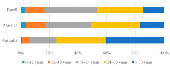 As shown in Figure 2, there are differences in Chinese consumers’ willingness to pay for beefsteak imported from Australia, America, and Brazil. Approximately 40% of respondents are willing to pay more than CNY 30 for a piece of beefsteak imported from Australia, while less than 20% are willing to pay the same amount for beefsteak imported from Brazil or America. To calculate the mean willingness to pay (WTP), we assumed that the true value is the midpoint of the interval. For the upper-open interval, we assumed that the WTP value is equal to the sum of the lower boundary and half the distance to the neighboring interval. The mean WTP values for a piece of beefsteak imported from Australia, America, and Brazil are CNY 27.706, CNY 24.350, and CNY 24.298, respectively.