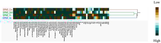 Volatile organic compounds in the studied species using SPME-GC-IEMS (Cm: Cucurbita moschata, Dch: Dianthus chinensis, Fr: Fuchsia regia; Vc: Viola cornuta).